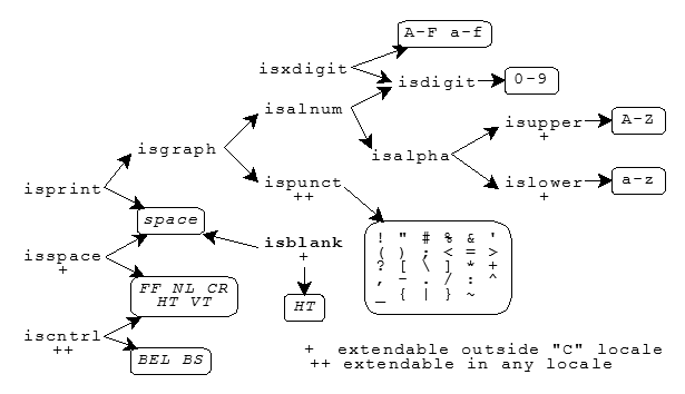 The diagram indicates with ++ those functions that can define additional characters in any character set. Moreover, locales other than the "C" locale can define additional characters that return nonzero for: