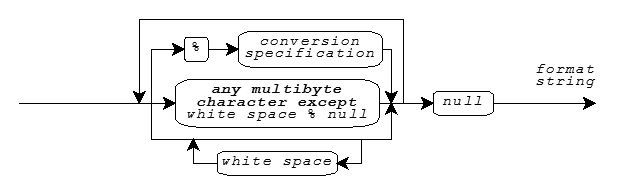 A format string consists of zero or more conversion specifications interspersed with literal text and white space. White space is a sequence of one or more characters c for which the call isspace(c) returns nonzero. (The characters defined as white space can change when you change the LC_CTYPE locale category.) For the print functions, a conversion specification is one of the print conversion specifications described below.
