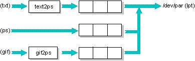 In this example, users send files with the lp utility to the appropriate queue, which converts the file through a copy-in filter (except for the ps queue). The queue then sends the converted data to the target, /dev/par.